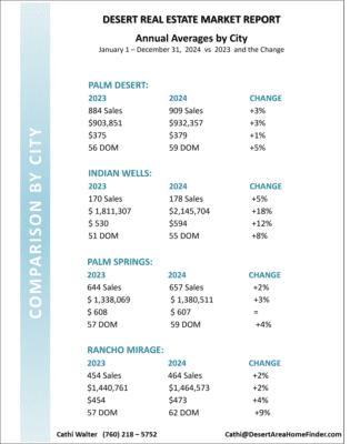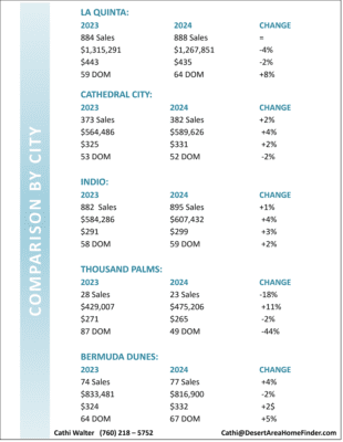 When we look at each city, Indian Wells is the stand-out. A November sale at $11m, (the highest selling price in The Reserve), put Indian Wells over the top for the largest price increase, up 18% from 2023.