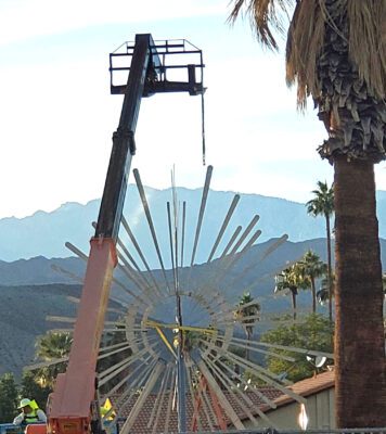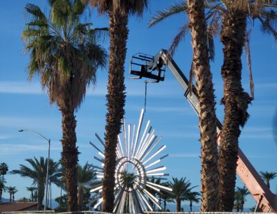 The city started making plans for the installation and the artist started working on turning his design concept into reality. The artist explains, this 25′ tall abstract stainless steel sculpture can be interpreted to represent multiple concepts, the sunrise/sunset, a flower that opens and closes as the viewer circulates around it, or an abstract palm tree that celebrates Palm Desert’s natural beauty. As a Sunburst, it pays homage to the Sun, a perfect symbol for what Palm Desert is all about.